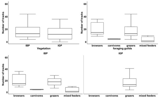 Frequency of occurrence of the number of tracks per treatment by vegetation type (top left), foraging guilds for both vegetation types (top right), and the interaction between vegetation and foraging guilds, bottom two plots (IBP = Indigenous bush-dominated plots, IGP = Indigenous grass-dominated plots). Boxes show medians (solid black line across the box) and 1st and 3rd quartiles.