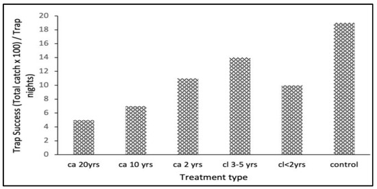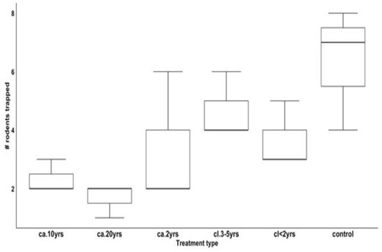 The results of a GLMM showed that treatment type (Wald χ25 = 10.62; p = 0.050) was a significant predictor of the number of small mammals trapped, with the highest number of rodents trapped in the control followed by areas that had been cleared of L. camara for cl. 3–5 yrs, cl < 2 yrs, and areas that have been invaded by L. camara as follows: ca. 2 yrs, ca. 10 yrs, ca. 20 yrs, respectively (Figure 7).