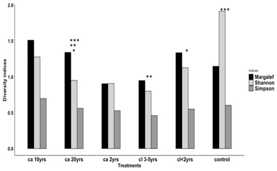 The ANOVA revealed statistically significant differences for species diversity between treatments (F5 = 0.934; p < 0.001) and by season (F1 = 9.122 p = 0.003). For most treatments, species diversity was higher during the spring season except for the ca. 2 yrs and the control (Figure 8).