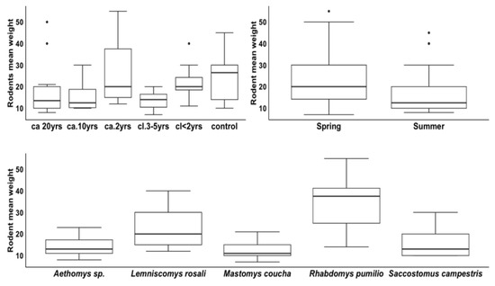 There were significant differences found for the weight of the rodents for treatments ca. 2 yrs, cl. 3–5 yrs; control for season: summer and for species: Lemniscomys rosalia, Mastomys coucha, and Saccostomus campestris (Table 6).