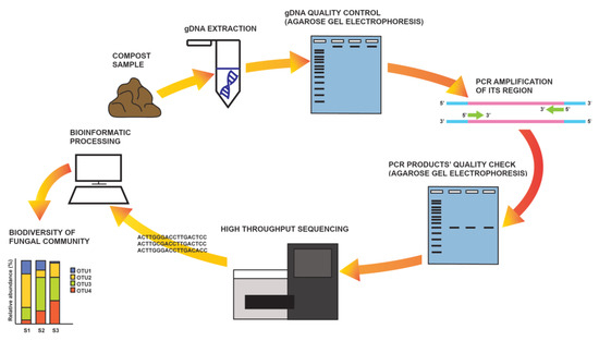 A somewhat less complicated approach compared to metagenomics is DNA metabarcoding (Figure 1), where only a DNA barcode, i.e., the ITS region in fungi (although some others are also in use), is targeted for HTS in an environmental sample [50]. The procedure includes the PCR amplification of the desired molecular marker and the sequencing of all the amplicons that are representative of all organisms present in the sample. Raw sequence data are first processed bioinformatically, and then sequences are clustered based on their homology and used for taxonomic or functional assignment by comparison to databases [103]. As HTS technologies are highly sensitive, one of the critical steps in the analysis is an experimental design based on multiple replicates. Additionally, special care should be taken to avoid sample contamination and/or sample overgrowing during storage (it is recommended to freeze or dry samples for storage). The DNA extraction procedure should be optimized depending on the sample type (e.g., soil, water, plant tissue). The selection of markers and primers is also critical, as most of them are not suitable for all fungal groups [101].