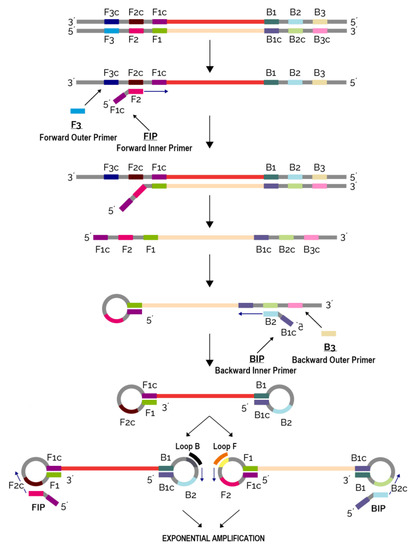 The LAMP method developed by the Japanese company Eiken has gained much popularity in the past years in the field of pathogen detection, especially in PON diagnostics [113]. Contrary to conventional PCR techniques that utilize different working temperatures enabled by a thermal cycler, LAMP does not require changing temperatures and hence can be performed by relatively simple, portable and handheld devices. An additional difference to PCR is that LAMP requires a set of four (to six) primers binding to six (to eight) different regions of the target gene. The use of a high number of primers increases reaction specificity (Figure 2). The ease of use, high sensitivity and specificity render LAMP a method of choice for PON diagnostics that can yield fast and precise results from even a small sample, e.g., from only six DNA copies in the reaction mixture [114].