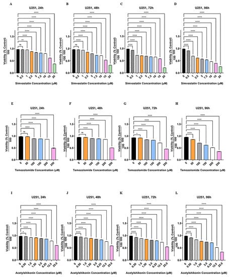 Simvastatin, temozolomide and acetylshikonin induce cell death in human glioblastoma cells. U251 cells were treated with different concentrations of Simva (0.5–20 µM, A–D), TMZ (50–100 µM, E–H), and ASH (0.5–25 µM, I–L), at four time points (24, 48, 72 and 96 h). The cytotoxicity of each treatment was measured using an MTT assay. The cell viability was measured (ns = non-significant; * = p < 0.05; ** = p < 0.01; **** = p < 0.0001) and compared to the time-match vehicle control. Simva induced a significant decrease in cell viability (p < 0.0001) for all concentrations at all time points, except 0.5 µM at 24 and 48 h (p > 0.05) and 1 µM at 24 h (p < 0.01). TMZ induced significant cell death (p < 0.0001) for all concentrations at all time points, except 50 µM at 24 and 48 h (p > 0.05) and 50 µM at 72 h (p < 0.05). ASH induced significant cell death (p < 0.0001) for all concentrations at all time points, except 0.5 µM at 24 h (p < 0.05). The represented findings are from nine replicates in three independent biological assays and are showed as the mean ± SD.