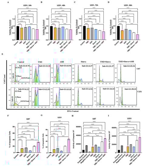 In our study, we used TMZ, Simva, ASH, TMZ/Simva and TMZ/Simva/ASH treatments to induce apoptosis in GBM cells. Concentrations of 1 µM Simva for U251, 2.5 µM Simva for U87, 100 µM TMZ (U251 and U87), and 1.5 µM ASH (U251 and U87) were used. The results showed that the apoptotic cell population for TMZ/Simva was 21 and 24% in U87 and U251, respectively, which is significantly higher than for TMZ (12%) and Simva (6%) single treatments in both cells at 72 h (p < 0.0001) (Figure 2E). TMZ/Simva/ASH combination significantly increased apoptosis compared to TMZ/Simva and ASH single therapy in U87 and U251 cells (p < 0.0001), (Figure 2F,G).