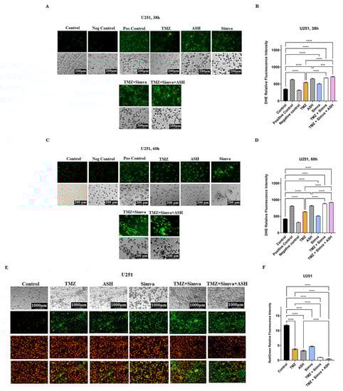 We assessed ROS in TMZ, Simva, ASH, TMZ/Simva and TMZ/Simva/ASH treatments at two different time points (38 h and 60 h). We observed a significant increase in ROS in all treatments, in both cell lines and time points in U251 (Figure 3A–D) and U87 (Supplementary Figure S3A–D) compared to the time-match vehicle control (p < 0.0001). However, ROS did not significantly increase in the Simva treatment in U87 cells at 60 h (Supplementary Figure S3C,D). Both TMZ/Simva and TMZ/Simva/ASH combination treatments significantly increased ROS (p < 0.0001) compared to single treatment, except for TMZ/Simva compared to TMZ treatments in U87 at 38 h (Supplementary Figure S3B) (p > 0.05).