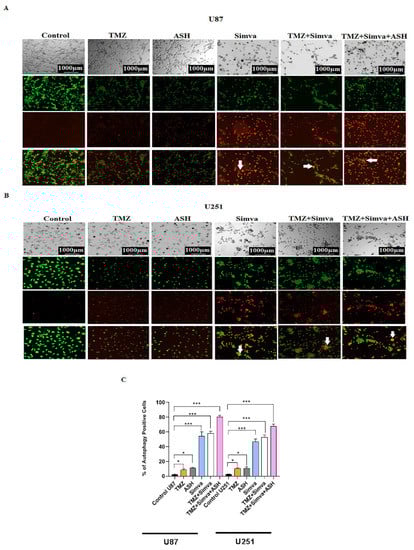 Autophagy and apoptosis are interconnected, as autophagy can positively or negatively control the apoptosis induction, based on the type of stimuli and the cell models [,,,]. In our recent investigations we have shown that Simva inhibits the fusion of autophagosomes and lysosomes, and increases the apoptotic response to TMZ treatment in GBM cell lines and primary patient-derived GBM tumor cells []. Therefore, in our current investigation, we addressed the impact of autophagy in response to TMZ/Simva/ASH combination treatment. We first evaluated AVOs using AO staining under different experimental conditions, including TMZ, Simva, ASH, TMZ/Simva and TMZ/Simva/ASH at 72 h. The results showed that the number of AVOs significantly increased in all experimental conditions, including TMZ and ASH treatments (statistical significance of p < 0.05) and Simva, TMZ/Simva, and TMZ/Simva/ASH treatments (statistical significance of p < 0.001) in both U87 and U251 cells (Figure 4A–C). The significant increase of AVO-positive cells in the combination treatments, including Simva and ASH, guided us to investigate the potential mechanism that led to this result. In our previous investigation, our team has shown that Simva co-treatment with TMZ increased the number of autophagosomes and AVOs, because of the inhibition of autophagosome and lysosome fusion in GBM cells []. Our current results showed that a combination of TMZ/Simva/ASH significantly increased the number of AVOs compared to TMZ/Simva treatment (Figure 4A–C).