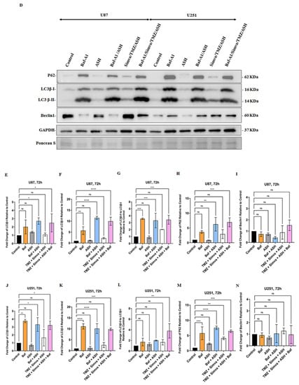 In the next step, we evaluated the biogenesis of autophagosome and autophagy flux in different experimental conditions (ASH, TMZ/Simva/ASH) using Baf-A1 and inhibition of autophagy flux (5 nM, 72 h). The results showed that the ASH treatment did not significantly change LC3β-II/LC3β-I and p62 in both U87 and U251 cells (p > 0.05) (Figure 4D,G,H,L,M). In addition, our results showed that there is no significant difference in LC3β-II/LC3β-I and p62 between Baf-A1 treatment and Baf-A1/ASH (p > 0.05) (Figure 4D,G,H,L,M). TMZ/Simva/ASH non-significantly (p > 0.05) increased LC3β-II/LC3β-I and p62, while Baf-A1 co-treatment significantly changed LC3β-II/LC3β-I and p62 in both U87 and U251 cells (p < 0.01, p < 0.001) (Figure 4D,G,H,L,M). Therefore, ASH treatment increases the number of AVO-positive cells via the fast turnover of autophagosomes, while TMZ/Simva/ASH increases AVO-positive cells via the partial inhibition of autophagy flux in GBM cells (U87 and U251).