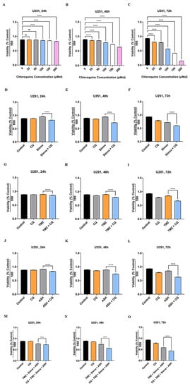 We have shown that the TMZ/Simva/ASH combination treatment induced a partial block of the autophagy flux in GBM cells (Figure 4). We further investigated the impact of autophagy flux inhibition in TMZ, Simva, ASH, and TMZ/Simva/ASH-induced cell death in GBM cells. We used chloroquine (CQ) as the autophagy flux inhibitor [,]. We first investigated the cytotoxic effects of CQ (25–200 µM) at different time points (24, 48 and 72 h) using an MTT assay to optimize the lowest concentration that inhibits the flux and has the lowest cytotoxic effect in GBM cells. The results are summarized in Figure 5A–C (U251) and Supplementary Figure S4A–C (U87), which show that the least toxic concentration of CQ that still inhibits flux (data was not showed) are 25 µM and 50 µM in U87 and U251 cells, respectively. Therefore, we used a combination of CQ (25 µM for U87, 50 µM for U251) with TMZ (100 µM), Simva (2.5 and 1 µM for U87 and U251, respectively), ASH (1.5 µM) and TMZ/Simva/ASH. CQ (autophagy flux inhibition) in combination with Simva (Figure 5D–F, Supplementary Figure S4D–F), TMZ (Figure 5G–I, Supplementary Figure S4G–I), ASH (Figure 5J–L, Supplementary Figure S4J–L) and TMZ/Simva/ASH (Figure 5M–O, Supplementary Figure S4M–O) significantly (p < 0.0001) decreased the cell viability in both U251 and U87 cell lines. Overall, it can be concluded that autophagy flux inhibition increased the triple-combination-treatment-induced cell death in GBM cells.