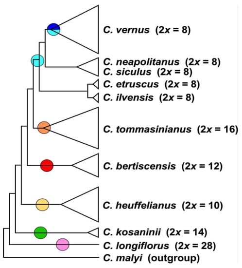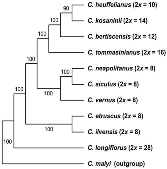 Chromosome counts—Most chromosome counts obtained in this study coincided with previous reports (Supplementary Table S3). The lowest chromosome count was in C. etruscus, C. ilvensis, and C. vernus (2n = 8) followed by C. heuffelianus (2n = 10); C. bertiscensis (2n = 12); C. kosaninii (2n = 14); C. neglectus, C. tommasinianus, and C. cf. vernus (2n = 16); PIC, SCC, and WCC populations of C. cf. heuffelianus (2n = 18); C. cf. heuffelianus from Montenegro and Serbia (2n = 20); C. cf. heuffelianus from Albania and Kosovo (2n = 22); and C. longiflorus (2n = 28). The chromosome count of a C. vernus-derived polyploid population from Central Albania, herein referred to as C. cf. vernus (2n = 16), is reported here for the first time (Supplementary Table S3, Supplementary Figure S1).