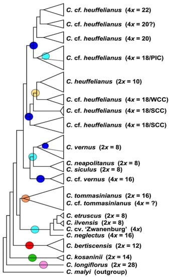Chloroplast-derived data—Series Verni diploids are split into two major groups in the phylogenetic tree of combined chloroplast data. The first group comprises C. heuffelianus (2n = 2x = 10), C. bertiscensis (2n = 2x = 12), C. kosaninii (2n = 2x = 14), and C. tommasinianus (2n = 2x = 16) (Figure 4, Supplementary Figure S4). The second group consists of two subgroups: (a) a group comprising the 2n = 2x = 8 species C. etruscus, C. ilvensis, C. neapolitanus, C. siculus, and C. vernus from its northern and western distribution range (Alps to Pyrenees, NW type), and (b) C. vernus from the southeastern distribution range (Dinaric Alps; SE type), which has C. longiflorus (2n = 2x = 28) as its sister group.