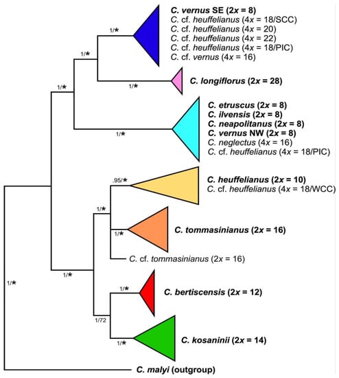 Schematic representation of relationships of species and cytotypes of Crocus ser. Verni obtained through Bayesian phylogenetic inference of sequences from two chloroplast regions (for original data see Supplementary Figure S4). Diploid accessions, as basic units in the series, are given in boldface. Numbers along branches indicate Bayesian posterior probabilities/maximum parsimony bootstrap values (≥50%), with asterisks for bootstrap support values >80%.