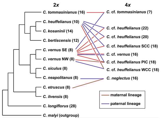 Schematic representation of species relationships in Crocus ser. Verni based on GBS, chloroplast, and nuclear single-copy gene data. For the tetraploids the maternal and paternal parents are indicated by lines connecting them to the respective diploid taxa. In brackets, chromosome numbers are provided.