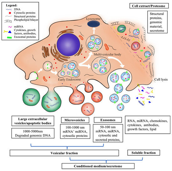 Mesenchymal stem cell-derived cell-free therapies and their components. Various particles are secreted from cells during function, bundled as vesicles or as soluble factors directly in the extracellular space. Vesicular fraction contains apoptotic bodies (1000–500 nm), microvesicles (100–1000 nm), and exosomes (50–100 nm). Apoptotic bodies are formed in response to apoptotic signals through the budding of the cell membrane and contain genomic material and mitochondria. Microvesicles are also created by the outward budding of the cell surface, while exosomes are secreted by the inward blebbing of the endosomal membrane (White arrows). Microvesicles and exosomes can contain receptors, transcription and transduction factors, enzymes, growth factors, lipids, and nucleic acids (DNA, mRNA, miRNA). The soluble fraction contains proteins, growth factors, and chemokines. Cell secretome or conditioned medium comprise of all the above. On the other hand, cell extract contains the cell secretome and the proteome (structural and cytoplasmic proteins, genomic material, and organelles) as it is obtained by whole cell lysis.