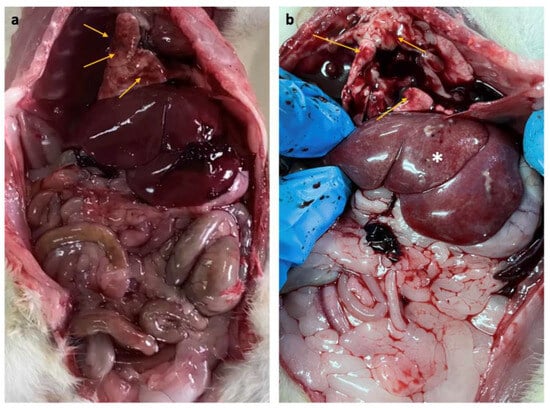 (a) Gross pathology of rats after two months of whole-body exposure to 150 kHz IF EMR showing multifocal and diffuse congestion (arrows) in the lung of the control and EMR groups, (b) multifocal and diffuse congestion (arrows) in the lung, inflammatory changes in the liver (asterisk) were observed only in the EMR group.