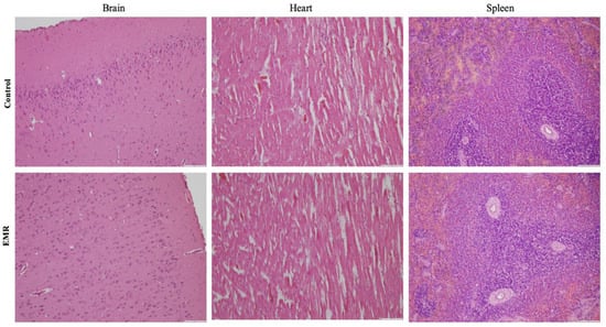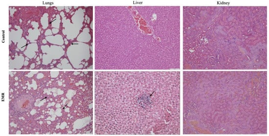 The internal organs of the control and EMR groups did not show abnormal changes or lesions at necropsy except for the liver and lungs. The lungs of both groups showed mild lesions such as multifocal to diffuse congestion without exudate on the surface or cut section in most animals. The liver showed mild inflammatory changes in some animals in the EMR group (six of ten animals) (Figure 3)