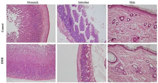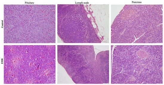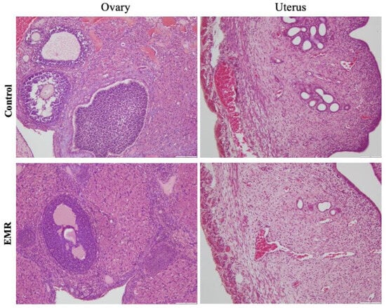 Histopathologic evaluation showed normal architecture of all examined organs in the EMR group (Figure 4, Figure 5, Figure 6, Figure 7 and Figure 8), which was comparable to that of the control group. However, changes were noted in the liver and lungs. The lungs showed thickening of the alveoli with interstitial inflammatory infiltrates and mild congestion in both groups. However, the intensity was more in most of the animals in the EMR group than in the control group. The liver showed normalized liver parenchyma consisting of hepatocytes and sinusoids with central venous and portal tracts. Some of the EMR specimens showed mild inflammatory changes with lymphocytic infiltration. The kidney showed normal renal morphology. Glomeruli, tubules, and interstitium appeared normal (Figure 4). The brain showed glial cells and typical neuronal architecture. Normal cardiac muscle fibres were seen in the myocardium. Normal lymphoid follicles and sinusoids were visible in the spleen (Figure 5). The pituitary gland showed small clusters of normal-looking basophils, acidophils and chromophobes embedded between thin-walled vessels. The lymph nodes had normal architecture, consisting of normal lymphoid follicles and parafollicular tissue. The pancreas had normal pancreatic acini and ducts and pancreatic islets (Figure 6). The mucosal epithelium and glands of the stomach appeared normal. The lamina propria appeared typical. The intestine (jejunum) displayed a typical mucosa with enterocytes and goblet cells lining the villi. The epidermis and dermis of the skin appeared normal (Figure 7). The ovary displayed typical ovarian morphology, including stromal cells and regular follicular development. The endometrium of the uterus was normal with typical uterine glands and blood vessels. The smooth muscle fibres of the myometrium were normal (Figure 8).