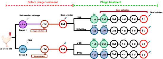 A total of 20 Salmonella-free broiler breeders (Hubbard Efficiency Plus, female) at 22 weeks old were authorized by Yisheng (Yisheng Livestock and Poultry Breeding Co., Ltd., Shandong, China) and strictly transported to avoid any contamination. Chickens were randomly divided into two groups (10 chickens/group). Each group was housed in a separate 20-square-meter room more than 50 m apart with wood shavings and waterlines by different experimental personnel to avoid cross-contamination. All experimental chickens were determined to be free of S. Pullorum infection via weekly Salmonella isolation from anal swabs before this experiment [25]. Chickens were provided with sterile feed and water ad libitum. The Group 1 chickens were inoculated with S. Pullorum CVCC526 (1.8 × 109 CFU) in 200 μL of PBS by injection into the breast muscle, and those in Group 2 were injected with PBS buffer only (Figure 1, time −3 week). Three weeks after Salmonella infection (day 0), the serum was collected from two groups of chickens, then the Group 1 chickens were divided into an S.P group (only Salmonella challenged) and an S.P + Phg group (Salmonella challenged and phage treated) with 5 chickens in each group, whereas Group 2 chickens without infection were divided into a Con group (control group) and a Phg group (only phage treated). To avoid any contamination of Salmonella or phages, the four groups were housed in separate air-filtered isolate cabinets (FENGSHI Group, Suzhou, China; instrument model: FS-GY size 2350 × 900 × 1750 mm) in a well-ventilated room with four compartments of approximately 10 square meters.