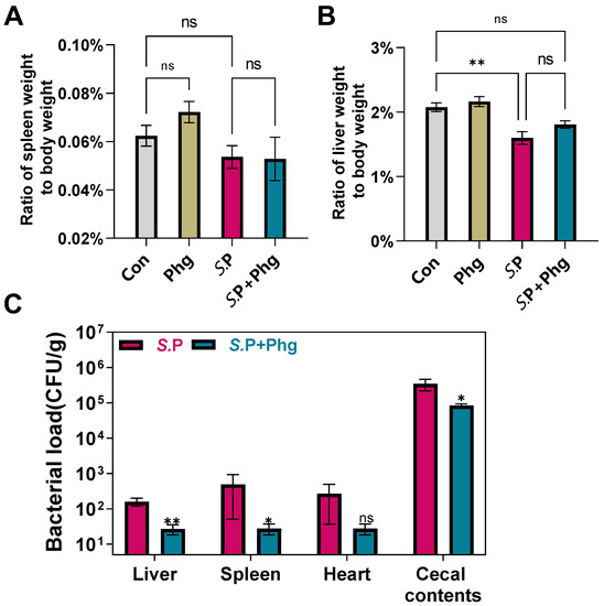 Phage CKT1 reduced the S. Pullorum load in various tissues of adult breeders. The ratio of spleen weight to body weight (A) and the ratio of liver weight to body weight at day 6 (B). ns, p > 0.05 (ordinary one-way ANOVA and post hoc Tukey’s test); ** p < 0.01. (C) S. Pullorum load in tissues at day 6. n = 5. ns, p > 0.05 (Mann–Whitney test); * p < 0.05; ** p < 0.01. S.P, only Salmonella challenged; Con, the control group; Phg, only phage treated; S.P + Phg, Salmonella challenged and phage treated.