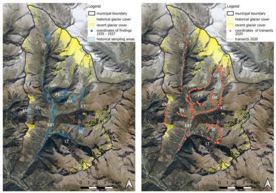 Sampling areas around Kals am Großglockner. The left plot shows the locations from 1935 and 1937 (blue dots) and the right plot the surveyed transects in 2020 (red dots and transects). Historical glacier cover is shown in yellow dashed areas [44], and recent glacier cover in yellow filled areas [50]. The abbreviations of the sampling sites are as follows: Kalsbachtal (KBT), Lesachtal (LT), Ködnitztal (KT), Foledischnitz (FS), Teischnitztal (TS), Dorfertal (DT), Raseggbachtal (RS), Kals-Matreier-Törl (KMT), Schönleitenspitze (SL), Figerhorn (FH), and base of the mountain Großglockner (GG). The municipal boundary is shown in black (data: community boundary—BEV, 2019, basemap.at, accessed on 5 January 2023).