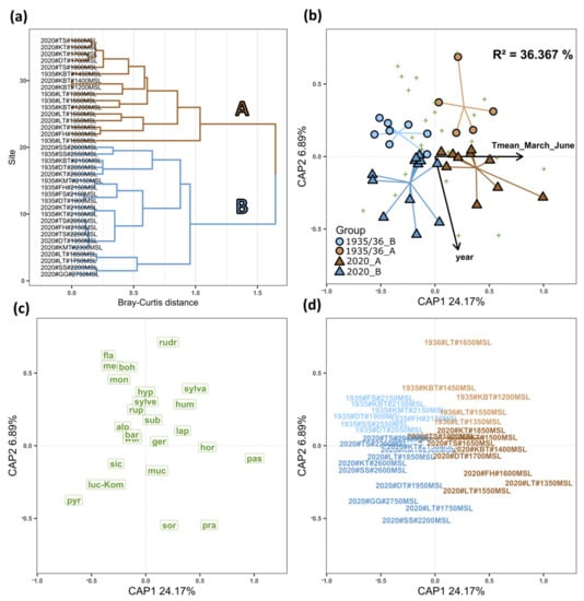 Analyses of bumblebee community composition of sampling units. (a) Cluster analysis (Hierarchical Clustering, method = “ward.D2”) and the clusters (A = brown and B = blue) extracted at Bray-Curtis distance = 1.5. (b) Ordination biplot of CAP modeling mean annual spring temperature and sampling period as constraints. Each point represents the community composition of one sampling unit, while colors and shapes indicate the four cluster groups (light colored circles = 1935/1936, dark colored triangles = 2020). Vectors indicate correlation of numeric values of mean annual spring temperature (“Tmean_March_June”) and sampling year (“year”) with community composition of sampling units. Values on axes refer to the percentage of explained variance. Name labels of sampling units, in reference to positions in (b), are shown in (d). Green crosses in (b) refer to the position of the species in the reduced ordination space, whose labels are shown in (c). Abbreviations in (a) and (d) denote sampling units: the first character string denotes sampling year (1935/1936 or 2020), second string denotes location (Kalsbachtal (KBT), Lesachtal (LT), Ködnitztal (KT), Foledischnitz (FS), Teischnitztal (TS), Dorfertal (DT), Raseggbachtal (RS), Kals-Matreier-Törl (KMT), Schönleitenspitze (SL), Figerhorn (FH), base of the mountain Großglockner (GG)), and third string denotes mean elevation of sampling unit (MSL = meters above sea level). Abbreviations in (c) are as follows: alp = B. alpinus, bar = B. barbutellus, boh = B. bohemicus, fla = B. flavidus, ger = B. gerstaeckerii, hor = B. hortorum, hum = B. humilis, hyp = B. hypnorum, jon = B. jonellus, lap = B. lapidarius, luc-Kom = B. lucorum/cryptarum complex, men = B. mendax, mon = B. monticola, muc = B. mucidus, pas = B. pascuorum, pra = B. pratorum, pyr = B. pyrenaeus, qua = B. quadricolor, rudr = B. ruderarius, rup = B. rupestris, sic = B. sichelii, sor = B. soroeensis, sub = B. subterraneus, sylva = B. sylvarum, sylve = B. sylvestris, wur = B. wurflenii.
