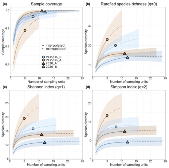 Rarefaction-extrapolation analysis showed that species richness estimates (Hill number q = 0) were significantly higher for 2020 cluster groups compared to 1935/1936 (Kruskal-Wallis test: chi-squared = 3.857, df = 1, p-value = 0.049, Figure 5b). The same results were obtained for the Shannon’s diversity index estimates (q = 1, Figure 5c) and inverse Simpson’s diversity index (q = 2, Figure 5d) when comparing cluster groups between 1935/1936 and 2020. Sample coverage was, on average, > 90% for all four cluster groups at an extrapolated/interpolated number of 10 sampling units (equal to two times the least common number of sampling units, Figure 5a).