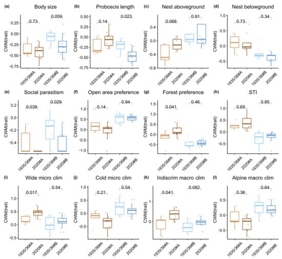 (a–l) Distribution of bumblebee species traits. For each cluster group, the CWM (community weighted mean) values of the (a) worker body size in millimeters, (b) worker proboscis length in millimeters, (c) share of aboveground nesting species, (d) share of belowground nesting species, (e) share of social parasitic species, (f) habitat preference for open areas, (g) habitat preference for forests, (h) a species temperature index (STI) according to Rasmont et al. [20], (i) wide microclimatic preference, (j) cold microclimatic preference, (k) indiscriminate macroclimatic preference, and (l) alpine macroclimatic preference are shown. Traits have been scaled and centered prior to CWM calculation, and y axes hence show transformed values. The first character string of cluster groups as shown on the x axis denotes the sampling year (1935/1936 or 2020), and the second denotes the group (mean elevation of 1550 masl (brown, A) and 2150 masl (blue, B)). Boxes represent CIs, lines represent means, and boxes represent +/− 1.5* (interquartile range). Dots represent actual values of sampling units. Letters indicate p-values of the Kruskal-Wallis rank sum test comparing the two sampling periods of the two cluster groups.