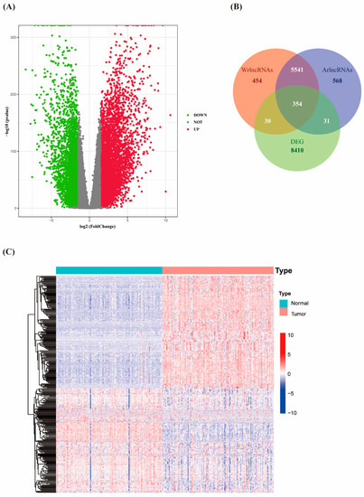 Identification of differentially expressed warlncRNAs in PAAD. (A) Volcano plot of DEGs between PAAD and adjacent normal tissue. (B)Venn diagram of wrlncRNAs, arlncRNAs, and DEGs intersection. (C) Heatmap of the expression levels of 354 candidate warlncRNAs.