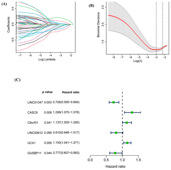 In total, 354 warlncRNAs were filtrated using univariate COX regression analysis, and 45 warlncRNAs were significantly associated (p < 0.05) with OS by Kaplan–Meier survival analyses. Then, the selected warlncRNAs were subjected to LASSO regression analysis. The warlncRNAs obtained from LASSO regression were used to screen the optimal warlncRNAs to construct the prognostic signature by applying multivariate Cox regression analysis. A prognostic signature was developed based on the coefficient values and expression levels of six warlncRNAs (LINC01347, CASC8, C8orf31, LINC00612, UCA1, and GUSBP11), with risk scores = ΣCoef × exp (genes).