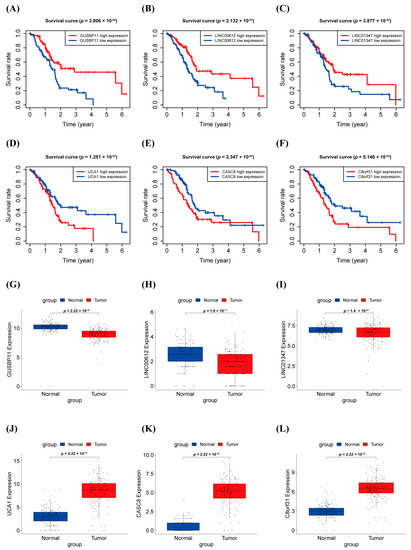 The OS analysis result of warlncRNAs indicated that the high expression of GUSBP11, LINC00612, and LINC01347 was positively correlated with longer overall survival of patients with PAAD (Figure 3A–C), while the high expression of CASC8, C8orf31, and UCA1 was positively associated with shorter overall survival of patients with PAAD (Figure 3D,E). The expression level of warlncRNAs was consistent with the result of the OS analysis. The expression levels of GUSBP11, LINC00612, and LINC01347 were significantly lower in PAAD than in normal tissue (Figure 3G–I), but CASC8, C8orf31, and UCA1 were inverse (Figure 3J–L). These results implied that GUSBP11, LINC00612, and LINC01347 were the protective factors in PAAD, while CASC8, C8orf31, and UCA1 were the carcinogenic factors in PAAD.