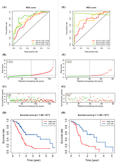 Prognostic value of warlncRNAs signature. (A) Time-dependent ROC curves of OS at 1-, 3-, and 5-year with other common clinical features in the training cohort. (B,C) Risk scores (B) and survival time (C) of each sample in the training cohort. (D) Kaplan–Meier analysis for OS of PAAD patients based on the risk group in the training cohort. (E–H) Prognostic value of warlncRNAs signature in the validation cohort.