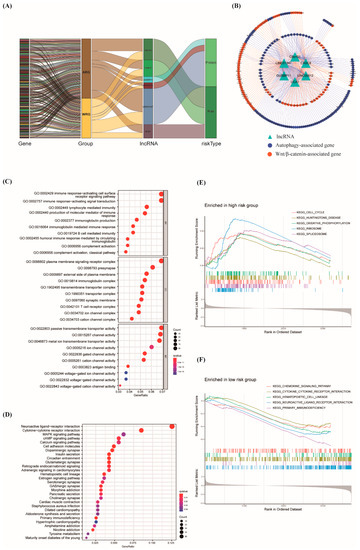 Construction of lncRNA-mRNA coexpression network and GO and KEGG enrichment analysis. (A) A Sankey diagram showed the co-occurrences of lncRNAs, mRNAs, and characters based on the risk score. (B) The lncRNA-mRNA network between six warlncRNAs and relevant mRNAs. (C) GO analysis of biological processes, cell components, and molecular functions based on the differentially expressed genes between the high- and low-risk groups. (D) The significantly enriched pathways of KEGG analysis based on the differentially expressed genes between the high- and low-risk groups. (E,F) The active biological pathways of GSEA shown in high- (E) and low-risk (F) groups. ARG: autophagy-related gene. WRG: Wnt/β-catenin related gene.