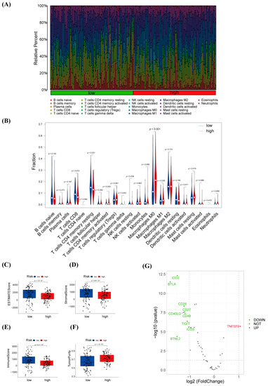 Identification of immunotherapeutic response based on warlncRNAs signatures. (A,B) The percentage proportion (A) and infiltration (B) of 22 immune cells between high- and low-risk groups in the training cohort. (C–F) Differential analysis of ESTIMATE (C), stromal (D), immuneScore scores (E), and tumor purity (F) according to ESTIMATE analysis between high- and low-risk populations in the training cohort. (G) The differential expression of 47 immune checkpoints between the high- and low-risk groups.