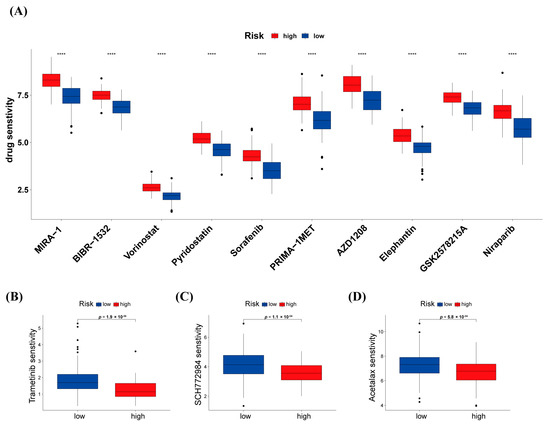 In this study, the distinction of patients based on risk scores led to personalized treatment strategies. Furthermore, the risk stratification of patients has been confirmed to predict the response to chemotherapy. The results of drug sensitivity analysis indicated that patients with PAAD in the high-risk group benefited less from multiple chemotherapy agents (Figure 8A). The targets of the top ten drugs were mostly linked to p53, KRAS, and autophagy, which played key roles in tumorigenesis in PAAD and also suggested the predicted efficacy of warlncRNAs signature. We found that the high-risk group patients were more sensitive to trametinib, SCH772984, and acetalax (Figure 8B). Briefly, the result can provide a more reasonable therapeutic procedure to improve the survival rate of patients with PAAD.