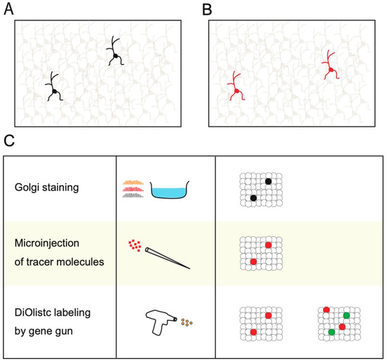 For Golgi staining, brain slices are fixed with chromic and osmic acids. The brain slices are then incubated with solutions containing silver nitrate (Figure 1A) [3]. After these treatments, single neurons are sparsely visualized in the brain slices (Figure 1A,C) [3]. An example of the successful application of Golgi staining is the discovery of synapses by Ramon y Cajal [2]. This has been one of the most significant discoveries in neuroscience [2]. Nevertheless, Golgi staining has several experimental limitations, such as the lack of cell-specificity and multicolor staining, incompatibility for combinational use with immunohistochemistry, and the impossibility of live imaging or examining relationships with functionalities [3].