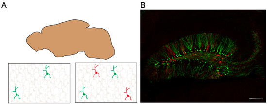 - Veldman, M.B.; Park, C.S.; Eyermann, C.M.; Zhang, J.Y.; Zuniga-Sanchez, E.; Hirano, A.A.; Daigle, T.L.; Foster, N.N.; Zhu, M.; Langfelder, P.; et al. Brainwide Genetic Sparse Cell Labeling to Illuminate the Morphology of Neurons and Glia with Cre-Dependent MORF Mice. Neuron 2020, 108, 111–127.e6. [Google Scholar] [CrossRef] [PubMed]