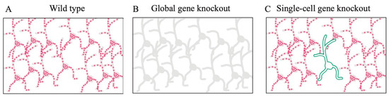Illustrations comparing global-and single-cell gene knockout. (A) The illustration shows a representative brain region of wild-type mouse. Red particles represent target proteins. (B) The illustration shows a global gene-knockout mouse. (C) The illustration shows a single-cell gene knockout in a representative region. The green color indicates the neuron in which the target protein was specifically knocked out. Green fluorescent protein (GFP) visualizes the neuronal morphology of this neuron, whereas the neighboring neurons show normal expression of the target proteins. Red particles represent target proteins.