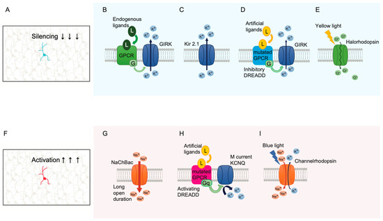 Second, designer receptors exclusively activated by designer drug (DREADD)-based chemogenetics allow neuronal activity to be modulated in a drug-induced manner (Figure 5D). Since GIRK channels are stimulated by GPCRs, the overexpressed GIRK channels open with stimulation by endogenous neurotransmitters, such as GABA, making it impossible to control the timing of suppression. To rectify this, DREADD-based chemogenetics have been developed. DREADDs are genetically mutated GPCRs that do not react with the original endogenous ligands and are activated only by artificial ligands [112] (Figure 5D). Therefore, neuronal excitability can only be suppressed when a specific ligand for DREADD is administered. DREADD technology can also activate neurons through a mutated muscarinic receptor, hM3Dq, which stimulates the Gαq protein. The stimulation can inhibit outward KCNQ channel current, which is known as M current, and lead to neuronal activation [112] (Figure 5H).
