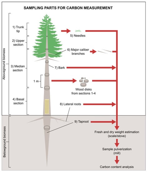 Schematic representation of plant biomass sample collection for carbon stock evaluation in slash pine trees. Five samples of every plant section indicated in the drawing were collected for every analyzed pine tree.
