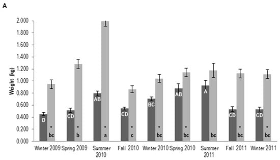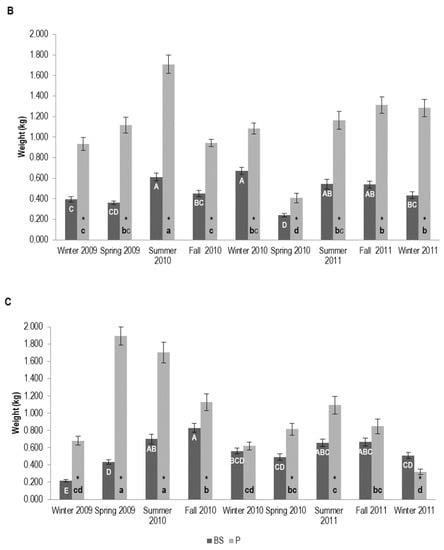 Seasonal resin production in three different slash pine plantations. (A) (Site A): 14-, (B) (Site B): 24-, (C) (Site C): 26-year-old stands (age at the installation of the experiments). Uppercase and lowercase letters compare resin yield within bark streak (BS) and paste (P) treatments, respectively, through different seasons from winter 2009 to winter 2011. Bars sharing a letter are not significantly different by the Tukey test (p ≤ 0.05). * Indicates the significant statistical difference between BS and P treatments in the same season by t-test (p ≤ 0.05). Note that in the southern hemisphere, the year change occurs during summer. This season commences either on December 21st or 22nd, depending on the summer solstice.