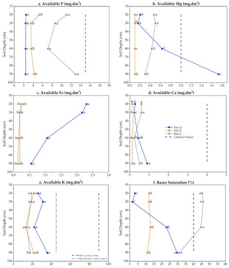 Mineral availability in soil from three different slash-pine plantations. Site A: 14-, Site B: 24-, Site C: 26-year-old slash pine plantations (age at the installation of the experiments). Each mean was calculated with ten combined samples from the same soil layer. Markers sharing a letter (within the same depth) are not significantly different by the Tukey test (p ≤ 0.05). Site A: blue line; Site B: orange line; Site C: gray line. Critical values are shown as dotted vertical lines (a,b,d,f) or dashed-dotted vertical lines for Sites B and C (e) (CQFS-RS/SC 2016—Brazilian Soil Society, https://www.siabrasil.com.br, accessed 8 November 2022). In (c), critical values were not defined.