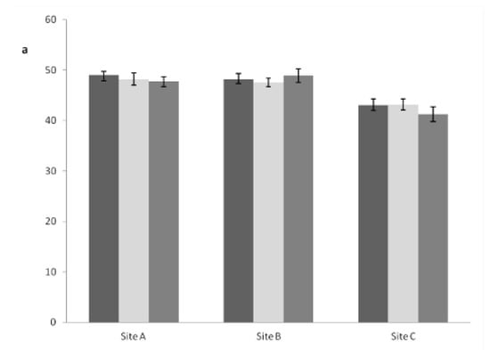 Tree density was 900 trees per hectare (ha) at sites A and C, and 600 trees per ha at site B. In the first year, on average, the highest trees were found in site C, the oldest pine plantation (22.38 ± 0.34 m) (Table 1). Statistical differences in tree height among treatments were only noticed in site B during the first year, and site C in the second year of evaluation (Figure S1a). In the first case, BS trees of 24 years were taller than those of P and IT. In the second case, P trees of 26 years were shorter than those of BS and IT.