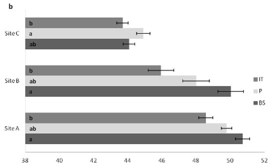The average percentages of total aboveground C content were 50%, 48%, and 44% for sites A, B, and C respectively. For belowground biomass, the total C content values were found to be approximately 48% (sites A and B), and 43% (site C) (Table 3). The total belowground biomass C percentage was not affected by the treatments in any of the sites (Figure 4a). Differences among treatments within each site were only observed for total aboveground biomass. In sites A and B, trees submitted to the BS treatment showed a higher average C percentage than trees under the IT treatment, whereas in site C, trees under P treatment had a higher C percentage compared to their IT counterparts (Figure 4b).