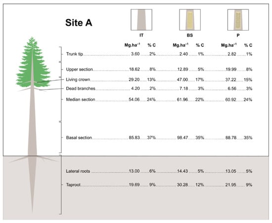 Values of C sequestered by trees in sites A and C were not statistically different (Figure S5). Trees growing in site A had relatively low weight (Figure S1b). Trees in sites B and C were similar in age and mass. Despite showing 300 trees/ha less than site C, an equivalent total C stock was seen for site B.