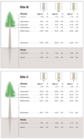 Carbon percentage values observed for sites A and B were consistent with a destructive carbon analysis performed in maritime pine plantations ranging from 1 to 47-year-old plants. In those areas, the carbon content average was 48.1% and 50.5% for root and shoot biomass, respectively []. For plants of this same species growing in a 50-year-old native pine forest, mean carbon concentrations of 53.6% in shoots and 51.7% in roots were recorded []. Studies with Pinus spp. plantations in southern Brazil (mainly loblolly and slash pines not tapped for resin production) used different estimated average carbon contents per tree compartment, including needles (41%), branches (45%), roots (44%), and trunks (45%) []. These values were generally lower than those of the present study (Table 3).