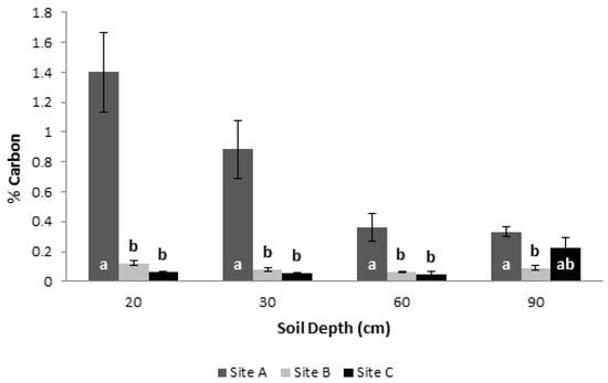 Soil carbon percentage from samples collected at different soil depths (20, 30, 60, and 90 cm), in three slash pine plantations featuring different ages. Site A: 14-, Site B: 24-, Site C: 26-year-old plantations (age at the installation of the experiments). Each mean was calculated with ten combined samples from the same soil layer. Bars sharing a letter are not significantly different by the Tukey test (p ≤ 0.05).