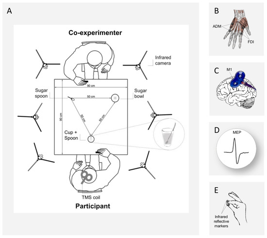 (A) Experimental setup. A 3-D Optoelectronic SMART-D system was used to track the participant’s and co-experimenter’s right hands kinematics by means of six infrared cameras. They sat in front of each other on opposite sides of a table. A sugar spoon and a sugar bowl were placed close to the co-experimenter, while a cup full of coffee with a spoon inside was placed close to the participant’s hand. (B) The EMG activity of the FDI and ADM hand muscles was recorded through two pairs of surface electrodes. (C) A TMS coil placed on the participant’s left M1 was used to investigate corticospinal excitability during action preparation and (D) TMS-induced MEPs were recorded. (E) Two infrared reflective markers were taped to the participant’s index and thumb fingers and a third was taped on the co-experimenter’s wrist for kinematic recordings.