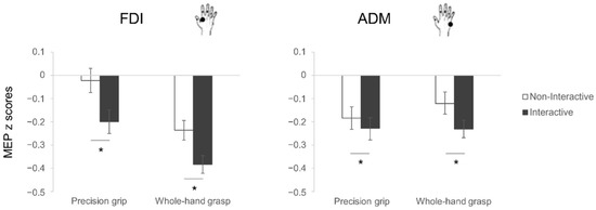 MEP results. Normalized MEP amplitude (z scores) of the FDI (left) and ADM (right) muscles during action preparation of precision grips (PG, stirring) and whole-hand grasps (WHG, lifting) under Non-Interactive (white) and Interactive (black) conditions. The error bars represent standard error of the mean. Asterisks indicate significant differences (p < 0.05) between conditions (planned contrasts).