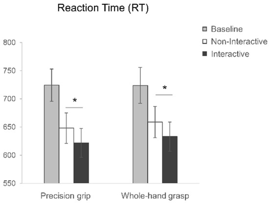 Reaction Time (RT) results for precision grip (PG) and whole-hand grasp (WHG) actions performed in the Baseline (grey), Non-Interactive (white) and Interactive (black) conditions. The error bars represent standard error of the mean. Asterisks indicate significant differences (p < 0.05) between conditions (planned contrasts).