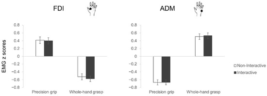 As for motor execution, the rmANOVA showed a statistically significant interaction between muscle and grasp (F1,27 = 166.41, p < 0.001, η2p = 0.86; Figure 4). Classical differences in muscular activity characterizing the two types of grasp emerged, in particular, ADM was more activated for WHGs than PGs (p < 0.001), and FDI was more activated for PGs than WHGs (p < 0.001). Furthermore, PGs were characterized by greater participation of FDI than ADM (p < 0.001), and WHGs by a greater participation of ADM than FDI (p < 0.001). The planned contrasts for each muscle showed no differences between Interactive and Non-Interactive conditions for both the PG (FDI: t27 = 0.31, p = 0.76; ADM: t27 = −0.10, p = 0.92) and WHG actions (FDI: t27 = 1.88, p = 0.07; ADM: t27 = −0.74, p = 0.47).