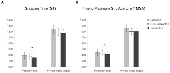 Kinematic results. Graphical representation of (A) Grasping Time (GT) and (B) Time to Maximum Grip Aperture (TMGA) for precision grip (PG) and whole-hand grasp (WHG) actions performed in the Baseline (grey), Non-Interactive (white) and Interactive (black) conditions. The error bars represent standard error of the mean. Asterisks indicate significant differences (p < 0.05) between conditions (planned contrasts).